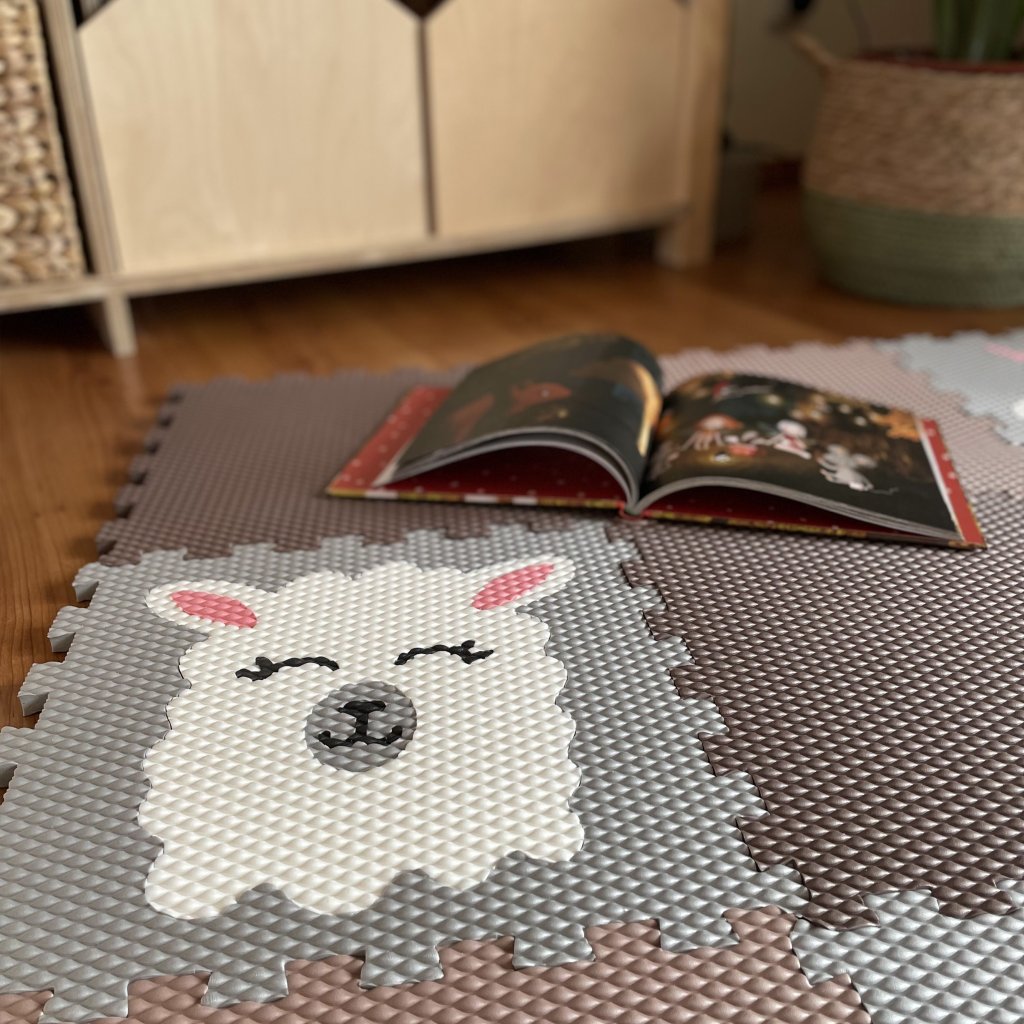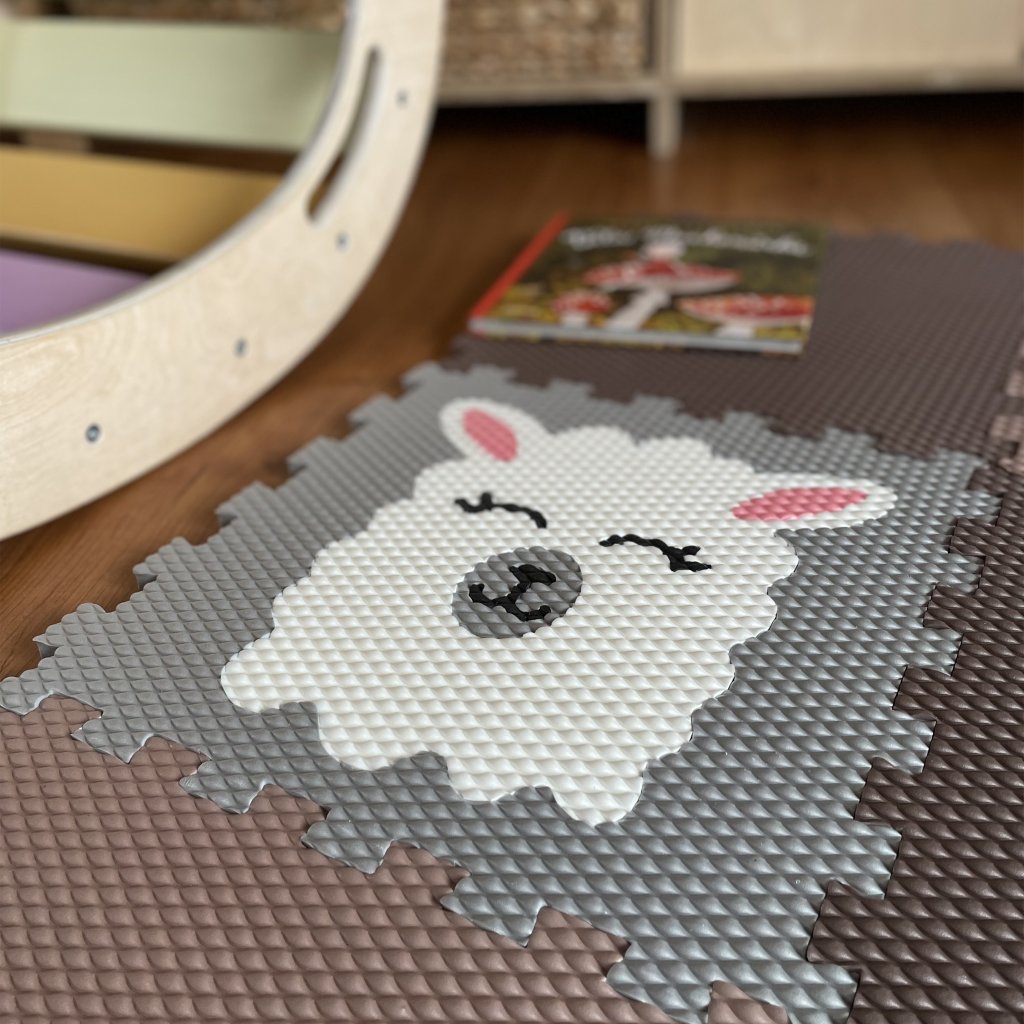 Podlaha s motívmi jednorožca, lamy, barana a leňocha sa skladá z 16 dielikov.